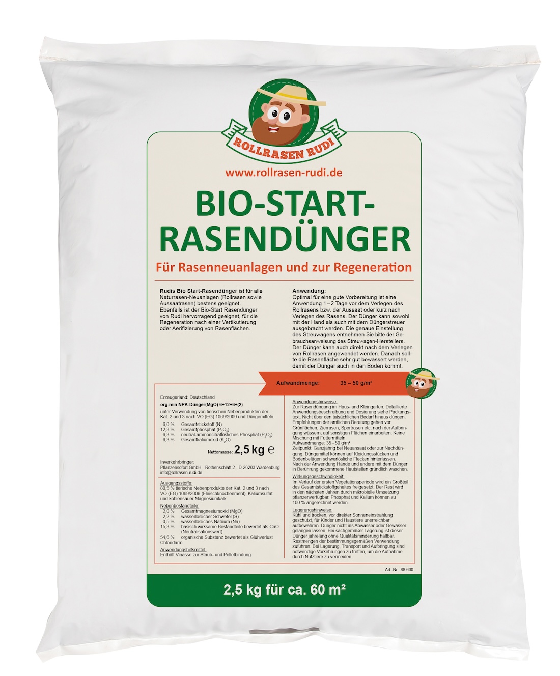 - Rudis Bio Start-Rasendünger verbessert das Wurzelwachstum des Rasens und eignet sich perfekt für alle Rasenneuanlagen (Saat- und Rollrasen)